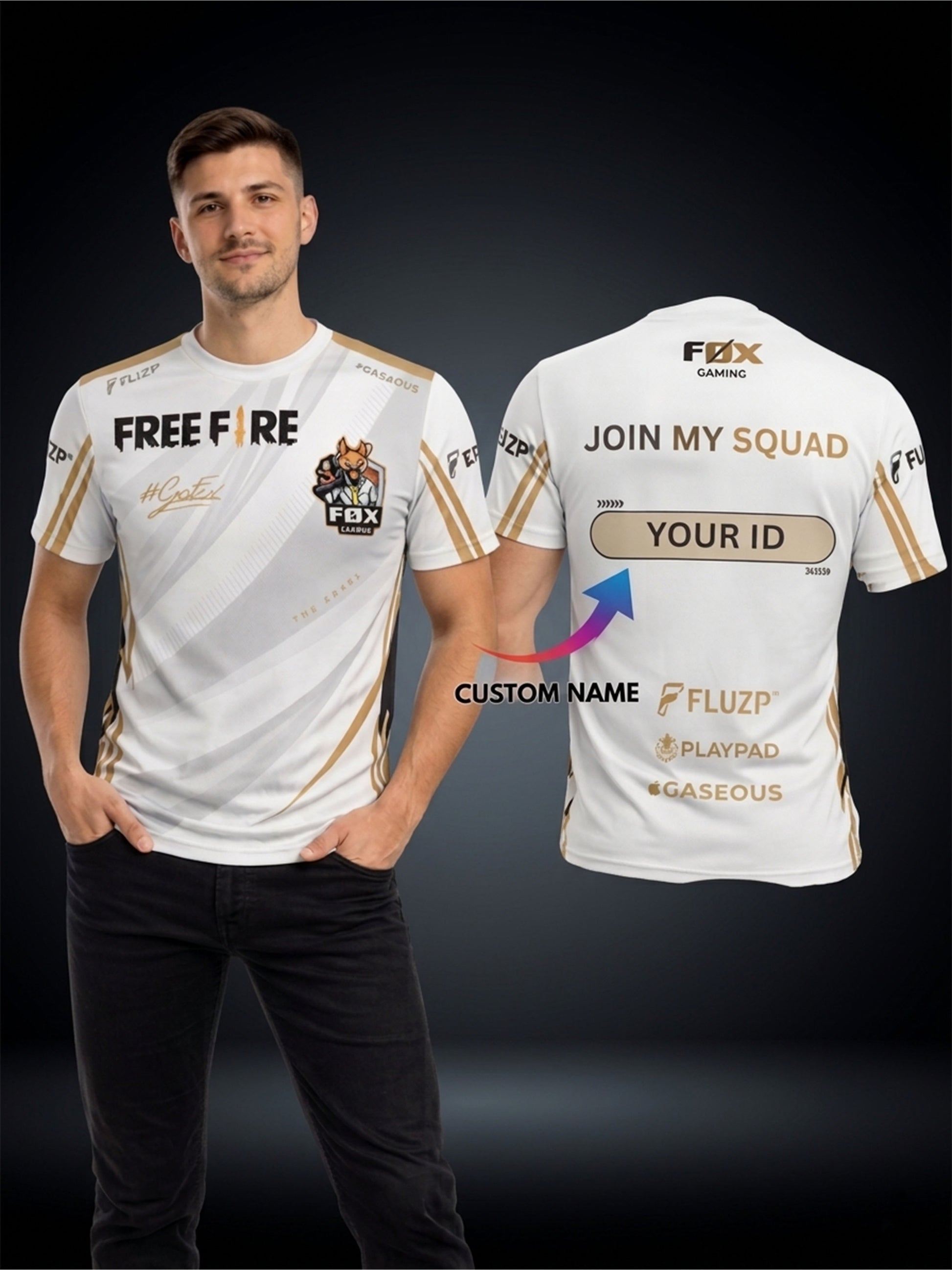 Upgrade your gaming style with our Free Fire Inspired Gaming T-Shirt with Custom Name & ID – designed for true gamers who want to stand out from the squad. Featuring a sleek white and gold esports design, this t-shirt gives you a premium, pro-level gaming look inspired by competitive gaming culture.